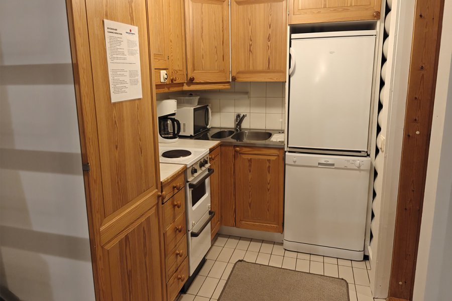 Standard kitchen equipments for food preparing, fridge, coffeemaker, water kettler, dishes for 6 persons, stove, microwave oven, oven, dishwasher.