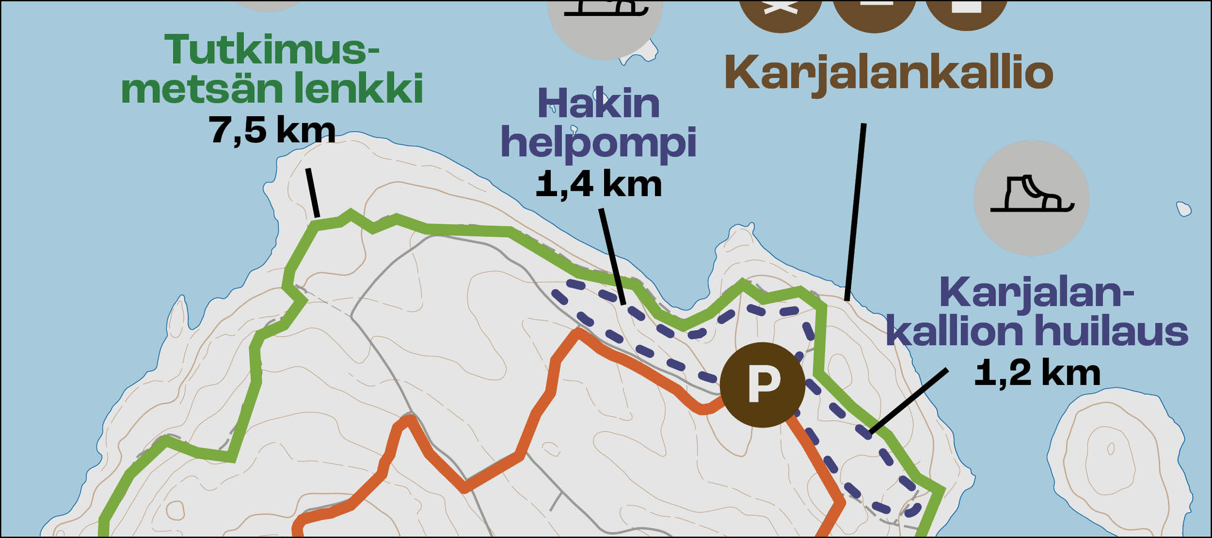 Hakin helpompi 1,4 km & Karjalankallion huilaus 1,2 km.