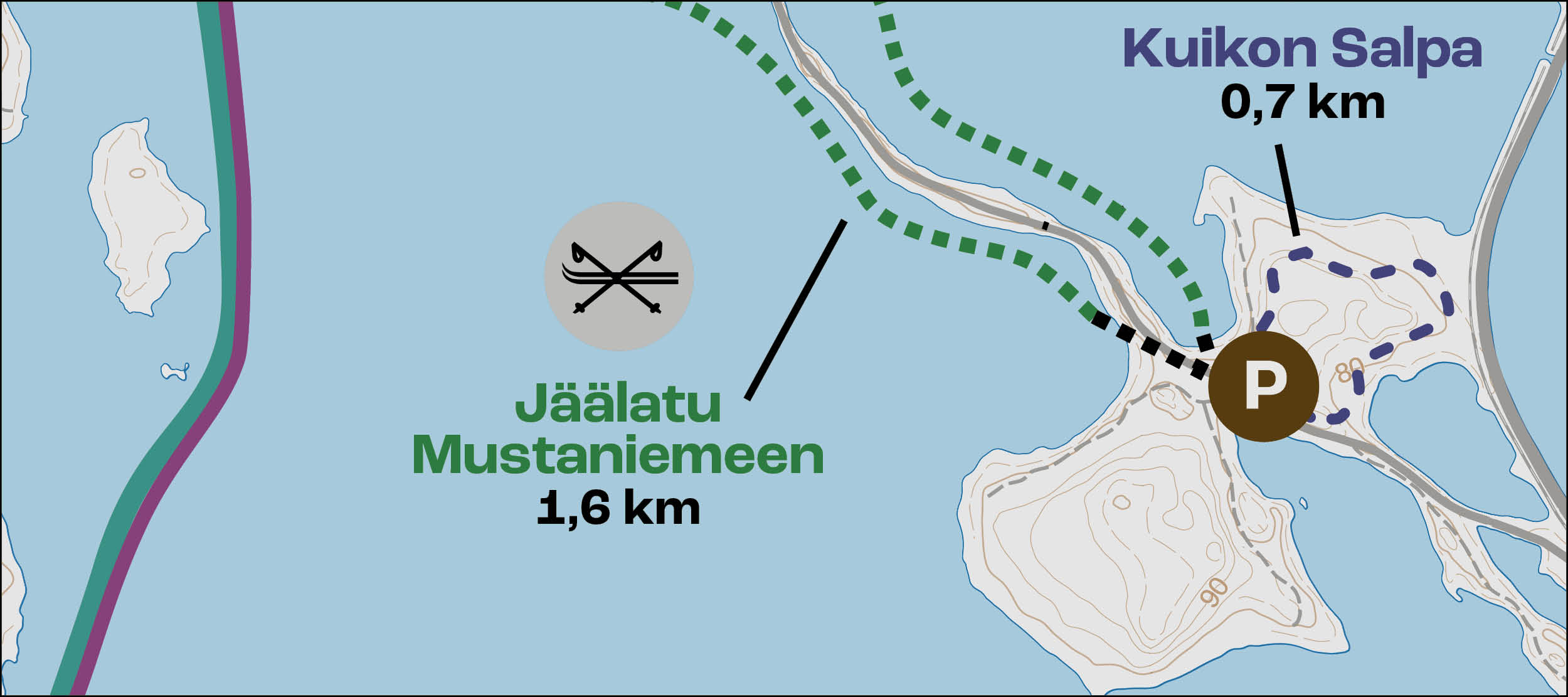 The starting point of the Kuikoniemi military history route is a parking area along the ridge road. Kuikoniemi was part of the 1,200 km long Salpalinja fortification chain built on the eastern edge of Finland in 1940-1941 and 1944. Renovated trenches can be found along the path. The Kuiko Salpa route is 0.7 km long.