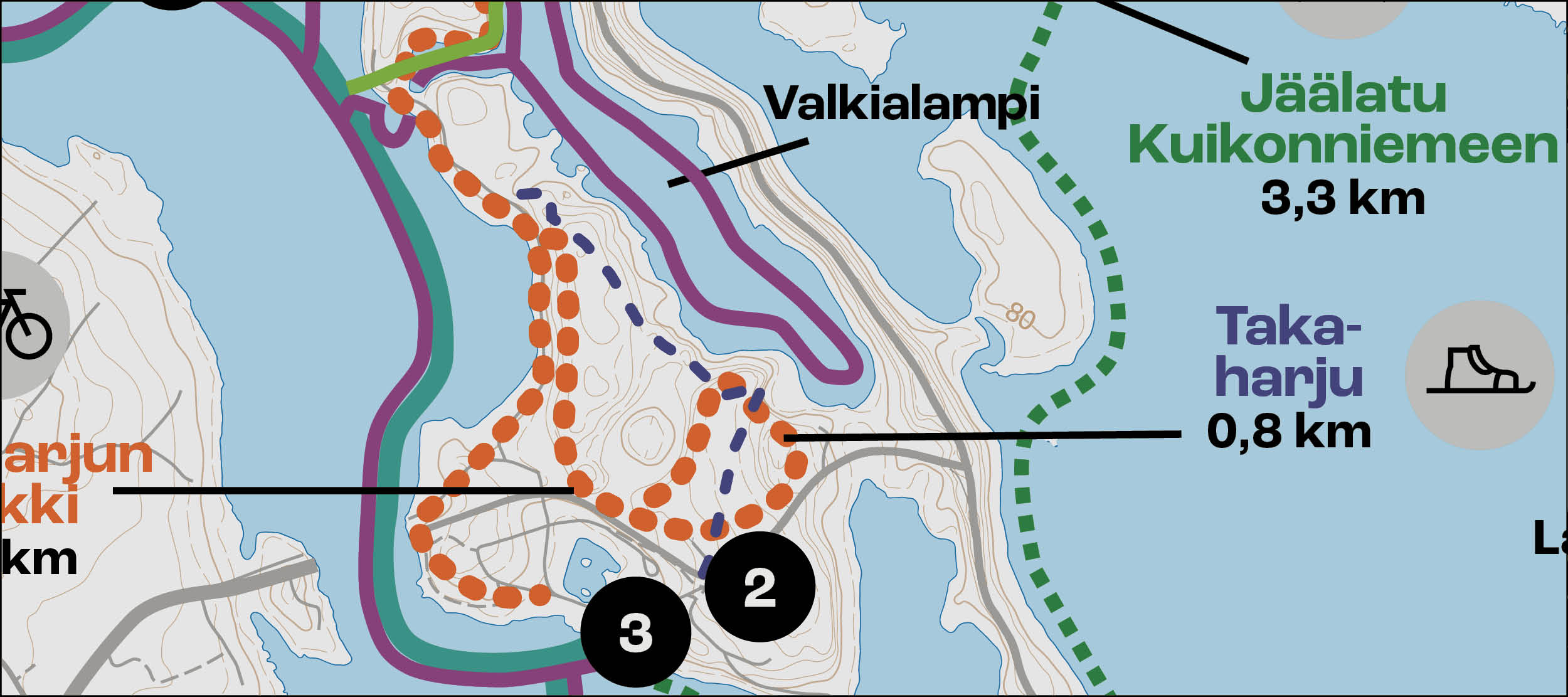 A wonderful route that takes you to the beautiful Takaharju viewpoint, from which you can enjoy a photogenic view in the direction of Valkialampi. From the viewpoint, descend and continue along the paths next to the pond in the forest towards the Topeliusen Polu intersection. The distance to the intersection is 0.8 km, and you can hike back to the starting point southwards either along the scenic path running over Takaharju or along the Topeliusen Polu visible on the shore of the lake.